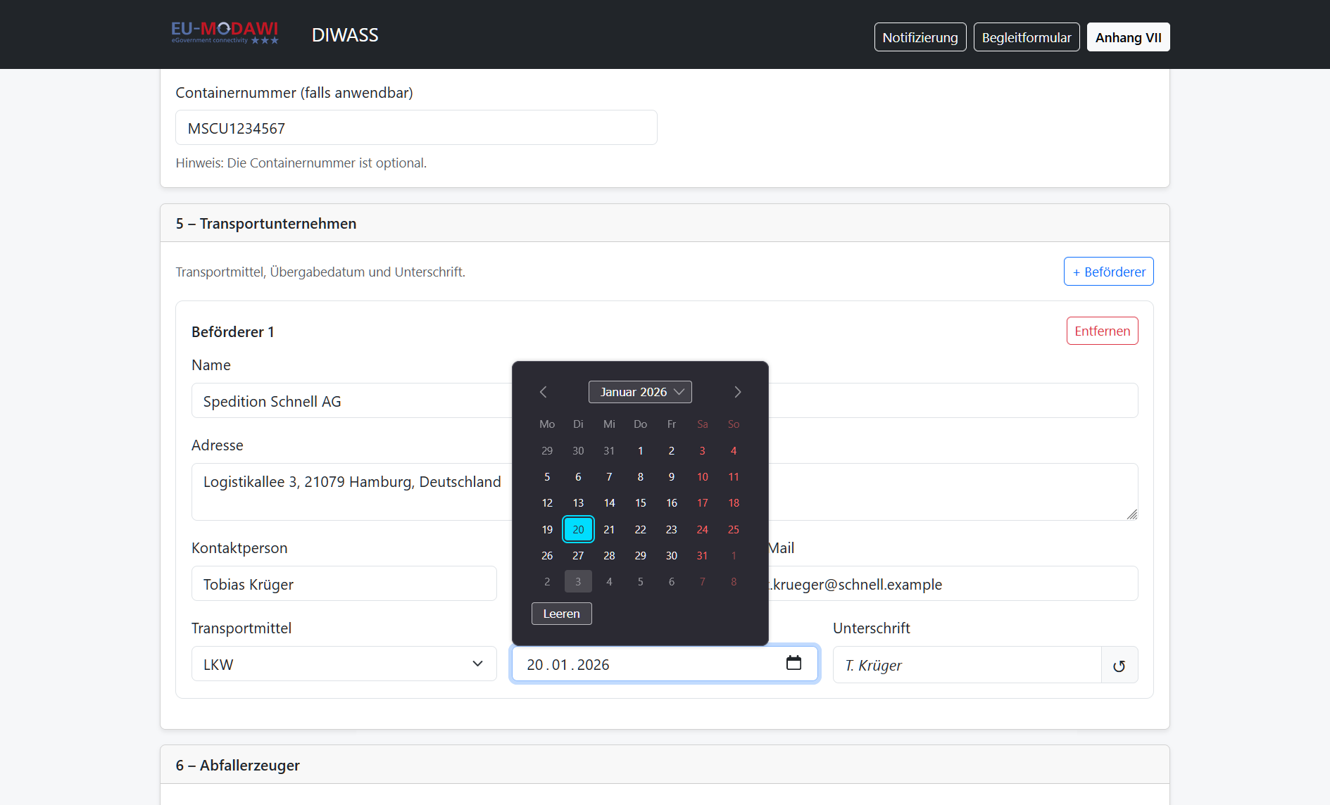 EU-Modawi unterstützt alle Dokumente der Verbringungsverordnung und erlaubt deren Erstellung oder Änderung. Über das API dürfen Sie jedoch keine Entwürfe an DIWASS senden. Wie der Modawi WebSigner kann daher auch das EU-Modawi Links an weitere Beteiligte versenden, damit diese in einer funktionalen Weboberfläche ergänzen und unterschreiben können.